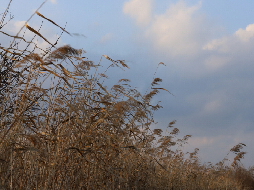 바람을 피해 반대편 아늑한 홈통 입구 갈대밭에 자리잡았습니다